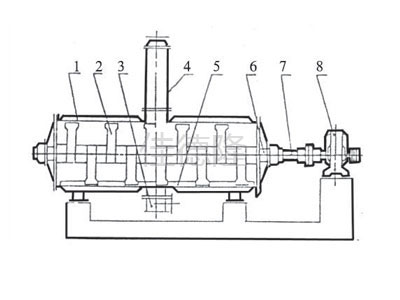 1.壳体2.耙齿3.出料装置4.加料装置 5.粉碎棒6.密封装置7.搅拌轴8.传动装置 |